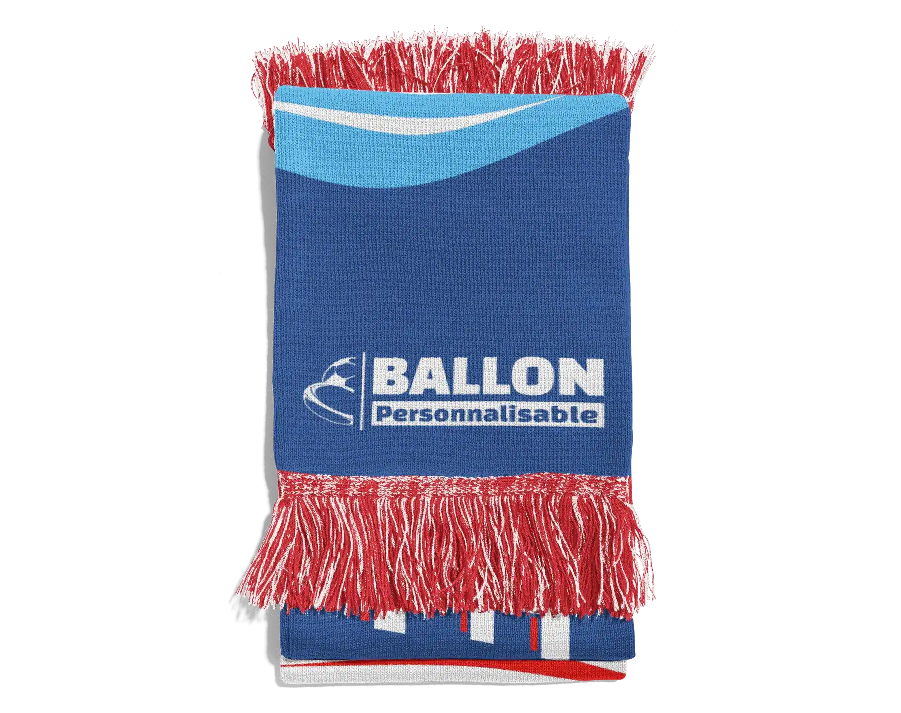 Écharpe tissée avec franges personnalisées (fabrication européenne) et fibre 100% acrylique. Visuel réalisé par tissage jusqu’à 5 couleurs unique au recto.